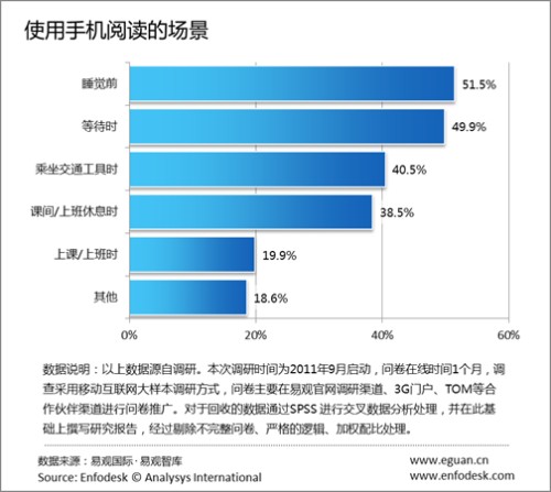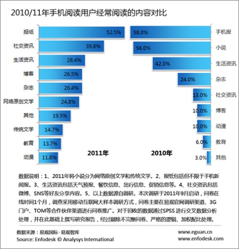 易觀國際(Analysys International)分析認為之所以微博、SNS等社交資訊在手機閱讀用戶經常閱讀的內容分類中超過小說主要有以下兩個原因: