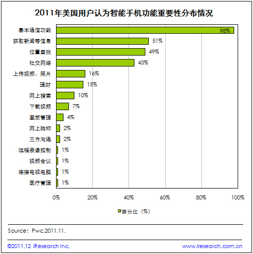 艾瑞咨詢根據(jù)Pwc近日發(fā)布的美國(guó)移動(dòng)互聯(lián)網(wǎng)用戶演變研究報(bào)告發(fā)現(xiàn),用戶對(duì)移動(dòng)設(shè)備的使用和依賴程度增強(qiáng),同時(shí),通過對(duì)用戶使用智能手機(jī)功能的調(diào)查發(fā)現(xiàn),用戶認(rèn)為最重要的功能主要集中在基本通信、獲取資訊信息、位置查找和社交網(wǎng)絡(luò)上。