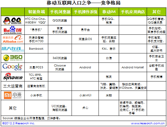 2011年,移動(dòng)互聯(lián)網(wǎng)領(lǐng)域發(fā)展熱度很高,競爭激烈。艾瑞咨詢整理發(fā)現(xiàn),移動(dòng)端的“用戶入口”成為傳統(tǒng)互聯(lián)網(wǎng)巨頭、移動(dòng)運(yùn)營商和移動(dòng)互聯(lián)網(wǎng)企業(yè)競爭的聚焦點(diǎn)。這充分體現(xiàn)出,第一,移動(dòng)互聯(lián)網(wǎng)的發(fā)展前景好,第二,移動(dòng)互聯(lián)網(wǎng)目前仍處在用戶積累和行為培養(yǎng)的過程。