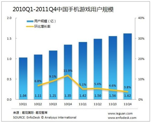 另外,從手機(jī)游戲市場規(guī)模來看,2011年第4季度手機(jī)游戲市場規(guī)模達(dá)到10.99億元,環(huán)比增長8.07%。