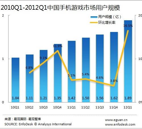 根據(jù)EnfoDesk易觀智庫(kù)產(chǎn)業(yè)數(shù)據(jù)庫(kù)最新發(fā)布的《2012年第1季度中國(guó)手機(jī)游戲市場(chǎng)季度監(jiān)測(cè)》數(shù)據(jù)顯示,中國(guó)手機(jī)游戲用戶規(guī)模穩(wěn)步增長(zhǎng),截止2012年第1季度達(dá)1.89億,環(huán)比增長(zhǎng)16.51%。