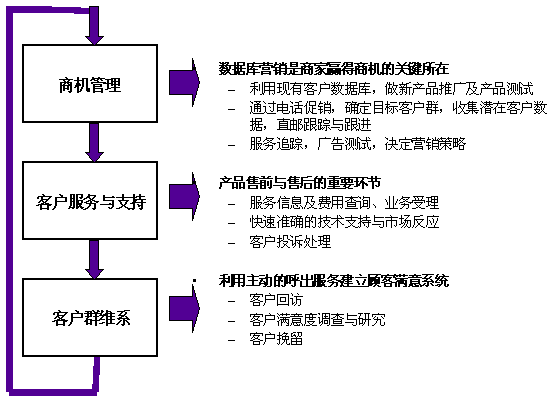 。。客戶關(guān)系管理的實(shí)施,必須首先建立客戶服務(wù)中心,進(jìn)行實(shí)地運(yùn)營,其核心要素為建立客戶和呼叫中心數(shù)據(jù)庫。該數(shù)據(jù)庫將記錄詳盡的客戶資料、消費(fèi)習(xí)慣和歷史服務(wù)資料,以便于提供個(gè)性化和定制化的服務(wù),提高客戶滿意度;IVR在較低的成本下提高服務(wù)水準(zhǔn),常見問題解答的數(shù)據(jù)庫提供了交叉銷售機(jī)會(huì),數(shù)據(jù)挖掘能夠辨認(rèn)出交叉銷售的機(jī)會(huì)和潛在客戶,生成直郵名單,通過客戶信息的即時(shí)顯示,對用戶呼入快速反應(yīng),提高交叉銷售的成功率等等。當(dāng)數(shù)據(jù)庫行銷的模式逐漸成型,并整合企業(yè)資料庫的資源后,客戶服務(wù)中心即具備了"開源"的功能,在企業(yè)中所扮演的功能角色已不再是業(yè)務(wù)部門的附屬地位,而可以成為獨(dú)立運(yùn)作的部門,并可以利用利潤中心的方式進(jìn)行管理。