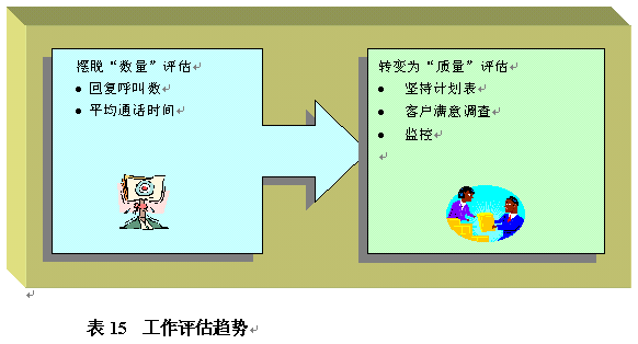 。。和對CSR工作的評估一樣,ProSci 1999表追研究也指出了當前對呼叫中心管理層的工作評估趨勢。這包括:員工生產力、員工激勵以及客戶滿意度。