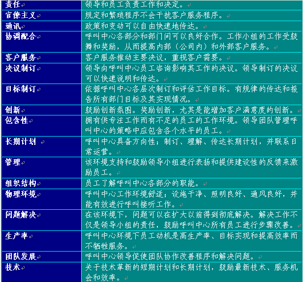 附錄6提供了建議的員工滿意度調(diào)查表?梢宰鳛闇(zhǔn)備制訂呼叫中心使用的版本的起點(diǎn)。在制訂表格時(shí),應(yīng)從所有中心最佳實(shí)踐工作和領(lǐng)導(dǎo)團(tuán)隊(duì)確認(rèn)的其他部門(mén)取得評(píng)估要素。表格6總結(jié)了呼叫中心員工滿意度調(diào)查應(yīng)包含的主要方面: