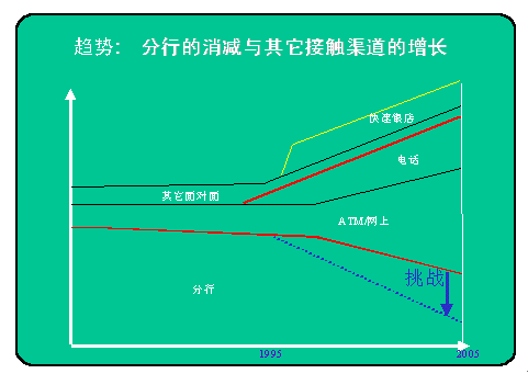 。。下圖為國(guó)外專(zhuān)家對(duì)銀行不同客戶服務(wù)渠道發(fā)展比例的說(shuō)明?梢钥吹,營(yíng)業(yè)廳的比例在逐年下降,而國(guó)外不少銀行甚至將進(jìn)一步壓縮營(yíng)業(yè)廳比例作為一項(xiàng)渠道的任務(wù)。電話銀行也就是通過(guò)IVR實(shí)現(xiàn)的自助服務(wù),自然是呼叫中心的一部分,但人工服務(wù),包括對(duì)上網(wǎng)及其它互動(dòng)方式的客戶提供的座席代表服務(wù),當(dāng)然更是現(xiàn)代呼叫中心業(yè)務(wù)的一部分,圖上雙紅線內(nèi)所表示的正是不斷發(fā)展的呼叫中心的所占比例。