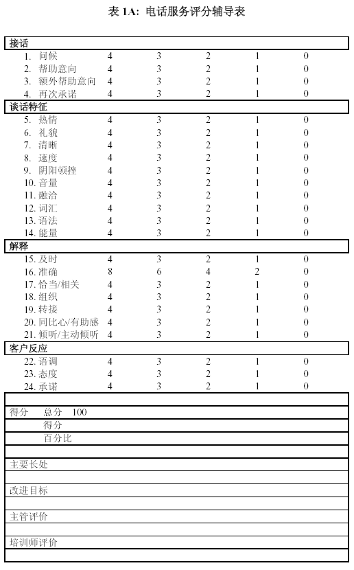。。2. 一個(gè)不可忽視的工作是對(duì)表中的各項(xiàng)進(jìn)行嚴(yán)格定義,然后主管與培訓(xùn)、質(zhì)檢師根據(jù)共同的錄音資料反復(fù)“核對(duì)筆記”,取得共識(shí),并將樣本打分結(jié)果發(fā)給座席代表溫習(xí)。