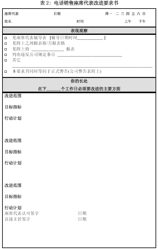 不能給出示范與明確改進(jìn)方向的管理絕對(duì)不是專業(yè)的管理。在這類輔導(dǎo)表之外,可以根據(jù)通話的評(píng)價(jià)和其它一些紀(jì)律觀察,設(shè)計(jì)一種“改進(jìn)要求表”,將根據(jù)表現(xiàn)觀察后制定的改進(jìn)要求詳細(xì)列出。如果公司有書面警告一類的程序要求,也可揉合進(jìn)改進(jìn)要求書。