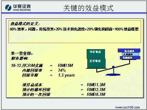華夏證券經(jīng)紀(jì)業(yè)務(wù)總部的姚磊作為唯一的成功應(yīng)用案例代表,主要是和與會的金融機(jī)構(gòu)分享在客戶關(guān)系管理規(guī)劃方面的一些成功經(jīng)驗(yàn)。華夏證券認(rèn)為,對于證券公司的經(jīng)紀(jì)業(yè)務(wù)來講,客戶關(guān)系管理的主要目標(biāo)應(yīng)該是把客戶關(guān)系管理系統(tǒng)的核心功能融入開戶、交易、服務(wù)、咨詢等四個與客戶互動的過程之中,比如:客戶資料規(guī)戶整合形成統(tǒng)一的客戶號,管理客戶交易偏好和產(chǎn)品偏好上的變化,配合多種渠道建立一對一銷售流程,客戶終身價值管理。在風(fēng)險(xiǎn)控制方面,華夏證券同樣貢獻(xiàn)了寶貴的經(jīng)驗(yàn),在這方面他們認(rèn)為最重要的方面是要做好高層領(lǐng)導(dǎo)的灌輸和培訓(xùn)工作,讓企業(yè)的高層領(lǐng)導(dǎo)對于客戶關(guān)系管理有一個正確的理解,從而對于項(xiàng)目的投資有一個合理的預(yù)期和實(shí)證,通俗一點(diǎn)說,就是首先為整個項(xiàng)目找一個合適的發(fā)起人。第二點(diǎn)要注意,要有專業(yè)的項(xiàng)目管理隊(duì)伍,這其實(shí)就是集成商選擇方面的風(fēng)險(xiǎn)。除此之外,還要對項(xiàng)目要有一個明確的定義,關(guān)注每一步提交的結(jié)果,在項(xiàng)目過程中就隨時發(fā)現(xiàn)問題、解決問題。
