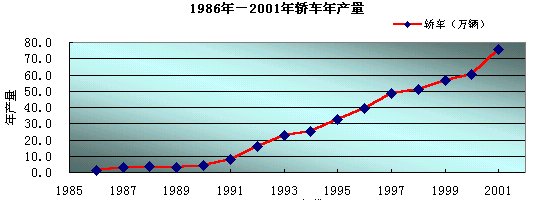 1986年以后,中國的轎車工業(yè)開始進入長期、穩(wěn)定、高速發(fā)展的時期。年產(chǎn)量從1986年的12,297輛增長到2000年的604,812輛,2001年的預(yù)計產(chǎn)量為76萬輛。