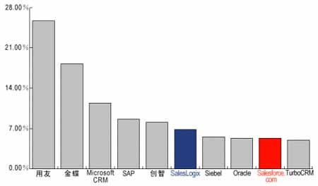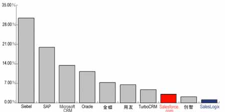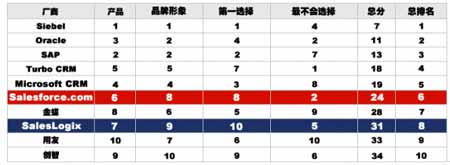 在"最不會選擇軟件商"調(diào)查上,Salesforce.com和SalesLogix分別以5.26%和6.81%的比例占據(jù)第二和第五的位置,分別低于平均比例(10%)4.7%和3.2%。