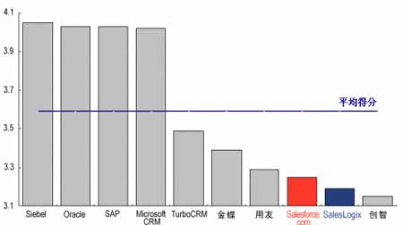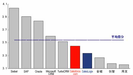 在產(chǎn)品調(diào)查方面,Salesforce.com和SalesLogix 的得分分別為3.45和3.34,占據(jù)第六和第七的位置,低于高于平均得分(3.53)2.3%和5.4%(如下圖所示)。