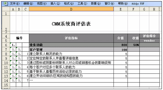 CMM體系中的標(biāo)準(zhǔn)并非在每一次評(píng)估中都需要用的,它實(shí)際上是一個(gè)滿足大部分CRM評(píng)估的標(biāo)準(zhǔn)的合集。所以應(yīng)用者首先要自己或者借助評(píng)估顧問(wèn)來(lái)選擇CMM指標(biāo)范圍,確定哪些指標(biāo)參與此次評(píng)估。