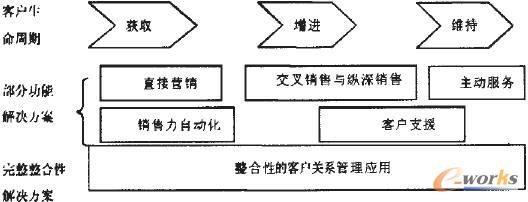 and Robinson的理論,所謂客戶關(guān)系管理的結(jié)構(gòu),乃是以客戶生命周期(獲取、增進(jìn)、維持)為依據(jù),配合不同階段下各異的功能性解決方案。產(chǎn)生整合性的客戶關(guān)系管理應(yīng)用。在此基礎(chǔ)得出的客戶關(guān)系管理的流程如圖l所示。