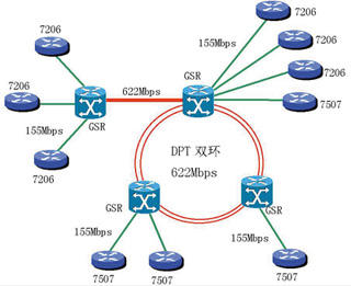 GSR12008是電信營運(yùn)級的高端交換路由器,在這里主干之間用DPT的622Mbps的IP光纖傳輸接口相互兩兩連接成SRP雙環(huán)。