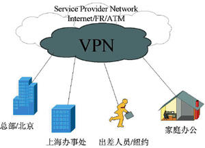 在如圖2所示的VPN 示意圖中,可以看出,VPN所賴以運(yùn)行的公網(wǎng)平臺可以包括各種實(shí)際的網(wǎng)絡(luò),例如IP網(wǎng)、幀中繼網(wǎng)、ATM網(wǎng),也可以就是因特網(wǎng)(Internet),因而也表明其網(wǎng)絡(luò)的范圍可以包括多個(gè)服務(wù)商。從地理范圍上看,VPN可以延伸到所有互相聯(lián)網(wǎng)的服務(wù)商所覆蓋的范圍。從用戶接入方式看,VPN可以包括服務(wù)商所提供的所有接入方式,如專線接入、撥號接入、無線連接等。