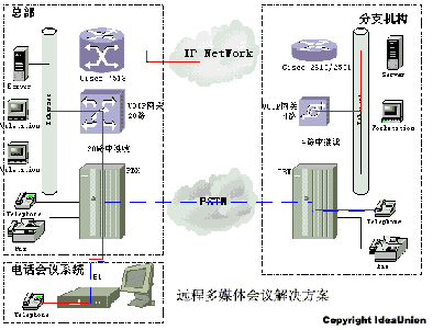 圖中紅色實(shí)線表示通過(guò)IP網(wǎng)絡(luò)傳輸語(yǔ)音的線路,藍(lán)色虛線表示通過(guò)PSTN傳輸語(yǔ)音的線路。由于通過(guò)IP網(wǎng)絡(luò)沒(méi)有使用額外的長(zhǎng)途線路,所以降低了遠(yuǎn)程會(huì)議系統(tǒng)的運(yùn)行成本。同時(shí)VoIP傳輸系統(tǒng)支持普通的長(zhǎng)途電話呼叫,為客戶節(jié)省長(zhǎng)途電話開(kāi)支。
