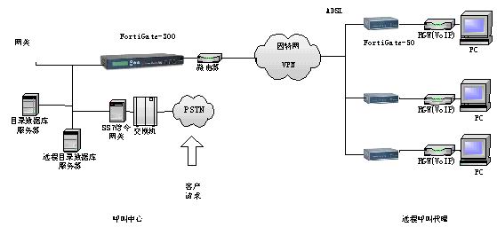 -300在總部,F(xiàn)ortiGate-50在遠程代理,為呼叫中心總部和遠程通信辦公室提供了可升級的解決方案,保證了良好的網(wǎng)絡(luò)傳輸性能,具有良好的擴展能力,