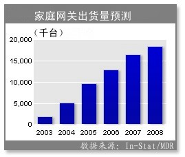 In-Stat/MDR分析師Mike Wolf說,未來5年家庭網(wǎng)關市場將推動寬帶CPE市場增長。市場將從2004年出貨低于500萬臺增長到2008年超過1800萬臺,年增長率30%。