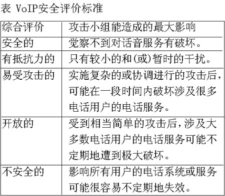 測試結(jié)果表明,采用了復雜攻擊手段的攻擊小組無法破壞思科公司的VoIP網(wǎng)絡,甚至無法對其造成顯著的干擾。這套精心制造的IP電話系統(tǒng)(包括第二層和第三層基礎設施以及各式各樣的附加安全軟件)是“安全的”(參見表中所示的VoIP安全評價標準),它最大限度地全面發(fā)揮了思科公司的網(wǎng)絡安全專長,利用了思科公司擁有的每一種防御武器。
