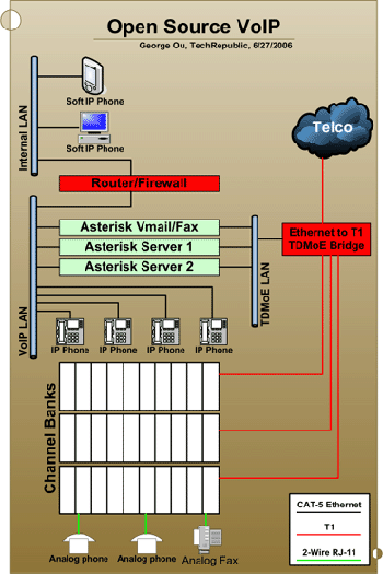 TDMoE(基于以太網(wǎng)的時分復(fù)用)LAN段負責(zé)PBX-語音郵箱和PBX-信道處理單元的通信。在過去,這些設(shè)備間的TDM通信使用昂貴的T1卡,但是通過將TDM通信搬到廉價的以太網(wǎng)上,這一點已經(jīng)得到極大的改善。
