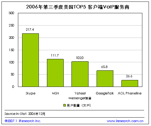 iResearch艾瑞市場咨詢根據In-Stat的統(tǒng)計數字整理發(fā)現,目前在美國VoIP市場中,以客戶端為服務基礎的服務提供商的用戶數量來看,占市場主導位置的五大服務商為Skype、MSN、Yahoo、Google和AOL.到2006年第三季度為止,Skype的用戶已經達到了217.4萬,排名第五位AOL Phoneline的用戶數量也有26.6萬之多。