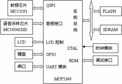 無線收發(fā)模塊采用Freescale公司符合IEEE802.15.4規(guī)范的射頻芯片MC13192,該芯片工作在2.4GHz頻段,提供16個(gè)無線通道,數(shù)據(jù)速率為250Kb/s[4],通過QSPI與主控芯片進(jìn)行數(shù)據(jù)交換。語音采樣模塊采用Motorola公司13位線形PCM編解碼芯片MC145483SD[5],該芯片對(duì)語音進(jìn)行AD采樣并形成線形PCM流,通過音頻接口與主控芯片交換數(shù)據(jù)。時(shí)鐘模塊的設(shè)計(jì)充分考慮手持設(shè)備的低功耗要求,提供高低兩種時(shí)鐘輸入。當(dāng)系統(tǒng)處于未通話狀態(tài),可向系統(tǒng)提供低頻率時(shí)鐘。時(shí)鐘輸入可通過軟件配置GPIO進(jìn)行選擇。因?yàn)橐幚泶罅恳纛l數(shù)據(jù)和固化代碼,擴(kuò)展了片外SDRAM和FLASH。其他模塊還包括鍵盤,LCD,串口和BDM調(diào)試接口,其硬件框架如圖5所示。