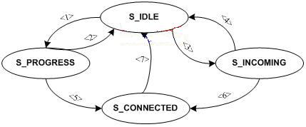“S_IDLE”狀態(tài)就是我們通常所說的待機狀態(tài)。當用戶撥打對方的SIPURI,協(xié)議棧通過發(fā)送INVITE請求消息,得到臨時響應消息,呼叫就處于“S_PROGRESS”,圖中箭頭<1>表示該操作引起的狀態(tài)切換。在“S_PROGRESS”狀態(tài),對方如果拒絕接受呼叫,狀態(tài)又返回“S_IDLE”,如箭頭<2>;當對方接受呼叫,就處于連接通話狀態(tài)“S_CONNECTED”,如箭頭<5>。在“S_IDLE”狀態(tài)也可能收到對方的呼叫請求,當UA應用發(fā)現(xiàn)一個新的呼叫請求,就應當切換狀態(tài)到“S_INCOMING”,如箭頭<3>;同樣,用戶可以拒絕接受呼叫,狀態(tài)切換回“S_IDLE”,如箭頭<4>;當用戶接受呼叫請求,呼叫狀態(tài)就處于“S_CONNECTED”。在“S_CONNECTED”狀態(tài),通話雙方任何一方的結束通話請求都會導致狀態(tài)返回“S_IDLE”,結束通話。