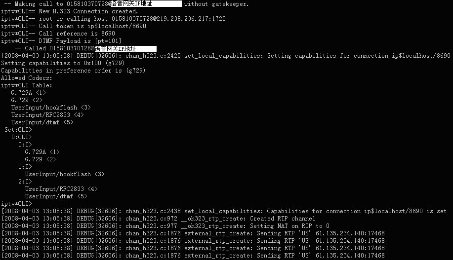 表示軟交換Asterisk與華為8010語(yǔ)音網(wǎng)關(guān)的H323連接已經(jīng)成功建立