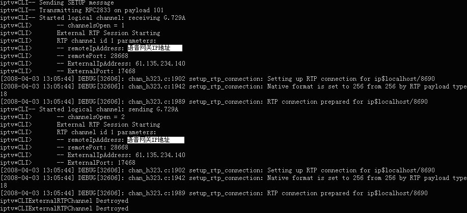 表示軟交換Asterisk與華為8010語(yǔ)音網(wǎng)關(guān)的H323連接在此釋放