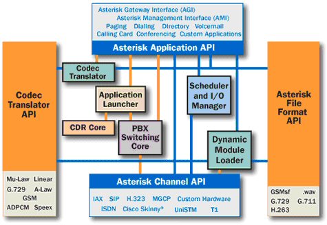 Asterisk 的結(jié)構(gòu)基本上是十分簡(jiǎn)單,但是它不同于大多數(shù)的電話產(chǎn)品;旧,Asterisk擔(dān)任的是一個(gè)中間件的功能,它連接了底層的電話技術(shù)和上層的電話應(yīng)用。Asterisk為布局混合的電話環(huán)境提供了一致性。Asterisk是開源PBX
