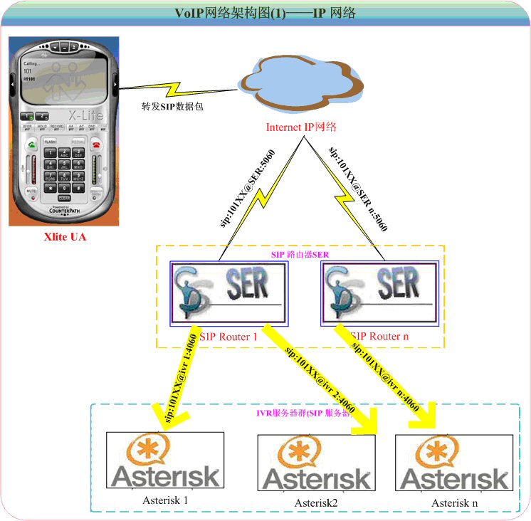 - X-Lite收集用戶撥打的號(hào)碼,并按照標(biāo)準(zhǔn)的SIP代理服務(wù)器到VoIP用戶代理服務(wù)器Asterisk。