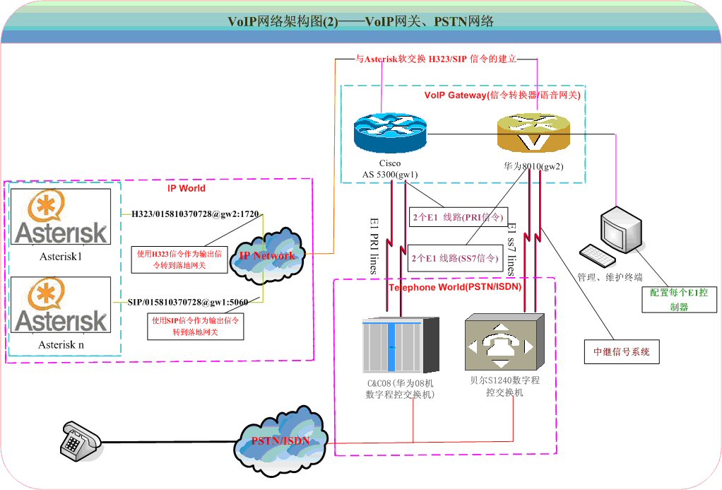 AS5300,華為8010等設(shè)備,一般有2、4、n個(gè)數(shù)字中繼接口)---->通過E1中繼線路對(duì)接數(shù)字程控交換機(jī)(華為C&c08、貝爾S1240數(shù)字程控交換機(jī))。