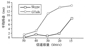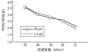 MOS(見圖3),發(fā)現(xiàn)在信道容量為50 kbit/s時GTalk利用了更多的帶寬,傳輸速率比Skype更高。當(dāng)信道容量變?yōu)?0