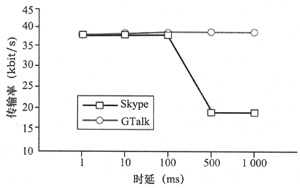 kbit/s降為19.36 kbit/s。然而,對于GTalk其傳輸率則沒有明顯變化。由圖6可知,在時延為1 ms、10