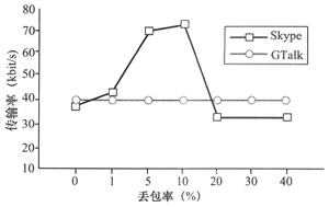 MOS分?jǐn)?shù)的下降。另一方面,Skype在有較高時,傳輸率有明顯的下降,導(dǎo)致業(yè)務(wù)質(zhì)量更糟。