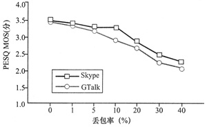 MOS方法評估了它們語音質(zhì)量的優(yōu)劣。通過實(shí)驗(yàn)可知:在理想的網(wǎng)絡(luò)狀況下,Skype表現(xiàn)得更好一些(兩者PESQ MOS的分?jǐn)?shù)差別為0.1),總體而言它們的語音質(zhì)量還是較為接近。在網(wǎng)絡(luò)有較長的時延時,Skype有不必要的適應(yīng)性。當(dāng)丟包情況發(fā)生時,GTalk沒有實(shí)施任何機(jī)制來提高其性能,與此同時,Skype使用數(shù)據(jù)冗余機(jī)制來對抗丟包以提高其語音質(zhì)量。在抖動情況發(fā)生時,兩者都沒有很好的機(jī)制來提高其適應(yīng)性。當(dāng)有較長的時延時,PESQ