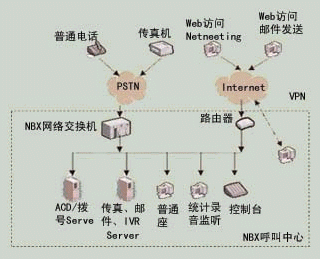 NBX呼叫中心是基于3Com公司NBX網(wǎng)絡(luò)電話交換機(jī)平臺(tái)構(gòu)筑的、語音數(shù)據(jù)合一的呼叫中心。系統(tǒng)配置拓?fù)浣Y(jié)構(gòu)如圖3所示。