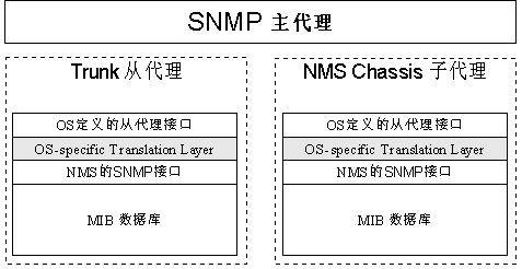 SNMP采用了Client/Server模型的特殊形式:代理/管理站模型。對網絡的管理與維護是通過管理工作站與SNMP代理間的交互工作完成的。每個SNMP從代理負責回答SNMP管理工作站(主代理)關于MIB定義信息的各種查詢。下圖10是NMS公司網絡產品中SNMP協(xié)議的實現模型。