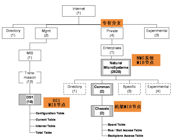 圖14中左圖給出了RFC2495對DS1/E1中繼線的MIB信息樹圖,右圖是NMS系統(tǒng)中對機架Chassis管理MIB約定。