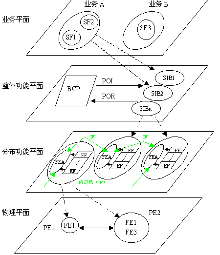 分布功能平面描述了每個SIB的功能是如何完成的。每個SIB包含三種元素:功能實體動作(FEA)、功能實體(FE)、功能實體之間的信息流(IF)。其中每個功能實體包含有若干個功能實體動作。下圖是ITU-T定義的分布功能平面模型: