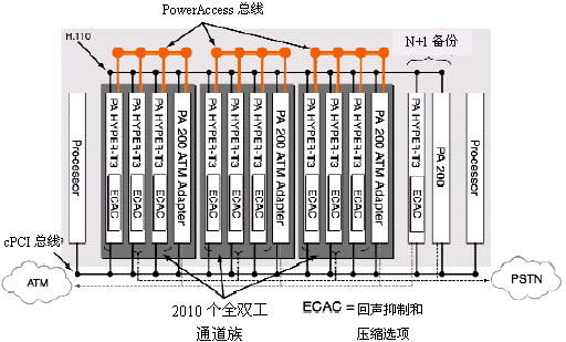 為了解決CompactPCI的這一限制,NMS開發(fā)出了PowerAccess體系結(jié)構(gòu),它借助現(xiàn)有的CompactPCI標(biāo)準(zhǔn),同時把它的通道容量擴(kuò)展到2048之上。這種體系結(jié)構(gòu)以PowerAccess總線為特色,PowerAccess總線是一個輔助的4096個TDM時隙,支持現(xiàn)存的CompactPCI H.110總線。由于提供語音通道的增多,從而可以提高系統(tǒng)的密度。