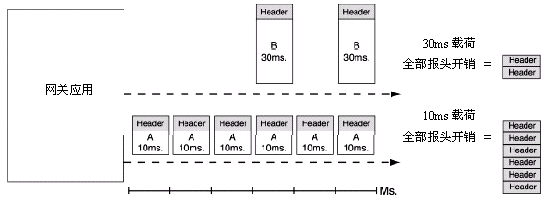 在一個減少發(fā)話方和受話方間音頻反應時間的努力中,VoIP網關通常會配置成發(fā)送較小的語音數據載荷。雖然這樣做通常可以減少聽得見的傳輸延遲,但同時也增加了一個給定語音數據流需要傳遞的包的數量。因為不管多小的音頻載荷都需要一個固定大小的包報頭,網上需要傳遞的數據量越大這個效果越明顯──跟隨的是網絡包和數據流量的相應增長。圖1說明了用于傳輸包報頭的帶寬會隨著包載荷大小的縮小而增大。