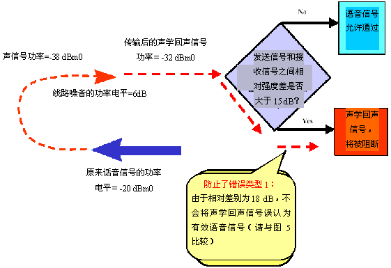 當通信鏈路的的另一端被設計為傳輸可變強度的信號時,"錯誤類型1"的影響會急劇增大。在這種情況下,根據功率電平的絕對差異來決定阻斷/允許信號的聲學回聲控制器會增大"錯誤類型1"出現的可能性。也就是說,使用絕對功率電平差異時,將聲學回聲信號誤認為有效語音信號的概率很大。