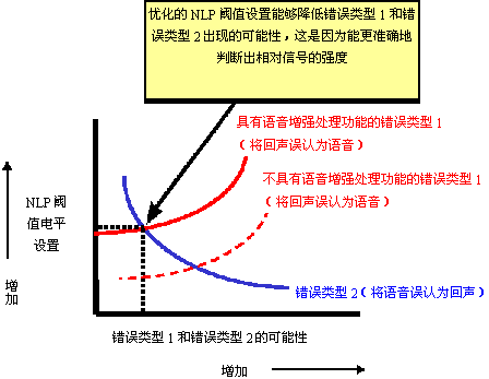 dB)能夠顯著降低將雙對話語音信號誤認為聲學回聲信號的概率,從而防止了"錯誤類型2"?傊"錯誤類型1"(實線曲線,具有語音增強特性)和"錯誤類型2"曲線的交叉點上,通過與之對應的NLP設置,可以獲得最佳的性能(請參見圖10)。
