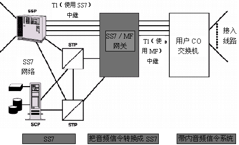 如圖14所示,SS7/MF網(wǎng)關(guān)可以實現(xiàn)SS7信令到MF(多頻)信令的轉(zhuǎn)換,使現(xiàn)有MF信令交換機無須升級就能擁有SS7信令能力;旌狭薙S7和基于音頻信令的呼叫建立環(huán)境能為各種運營商經(jīng)濟實用的SS7網(wǎng)絡(luò)接入方案,采用這一方案的有蜂窩電話運營商、本地電話運營商、長途電話運營商和其它一些仍使用舊式交換機的電話運營商。