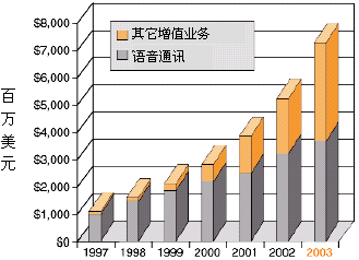 為了獲得競爭優(yōu)勢(shì),業(yè)務(wù)提供商──傳統(tǒng)長途運(yùn)營和本地交換運(yùn)營商,因特網(wǎng)業(yè)務(wù)提供商(ISP),應(yīng)用業(yè)務(wù)提供商,以及無線運(yùn)營商──都在想方設(shè)法發(fā)布基于IP的業(yè)務(wù),這些業(yè)務(wù)應(yīng)該:對(duì)用戶有較高的價(jià)值,能縮短面市所需時(shí)間,部署是低成本高效益的。向用戶提供高價(jià)值的增值業(yè)務(wù)能為業(yè)務(wù)提供商帶來重要的收入源泉,并使他們更有特色,增加市場(chǎng)分額,特別是如果這些業(yè)務(wù)以快速、易于支持的方式部署,以上這些優(yōu)勢(shì)就會(huì)更加突出。據(jù)估計(jì),到2003年增值業(yè)務(wù)設(shè)備僅在美國就能達(dá)到73億美元的市場(chǎng),正如圖1所示。