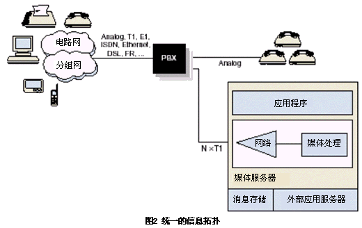 圖2是有前提的典型統(tǒng)一消息拓?fù)鋱D。這個(gè)例子中媒體服務(wù)器管理消息的存儲(chǔ)和提取,這些消息包括語(yǔ)音、傳真、數(shù)據(jù)或視頻。它可以訪問(wèn)不同媒體文件以及必要的控制規(guī)則以實(shí)現(xiàn)各類媒體業(yè)務(wù)?梢栽诒镜氐拿襟w服務(wù)器上也可以在遠(yuǎn)程的集中存儲(chǔ)系統(tǒng)上進(jìn)行存儲(chǔ)。在這種情況下,能提供語(yǔ)音和傳真資源的統(tǒng)一的消息系統(tǒng)通常和email系統(tǒng)比如微軟的Microsoft