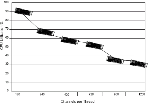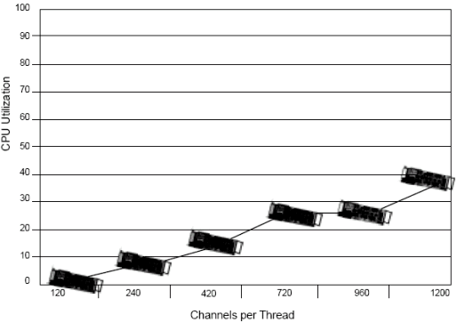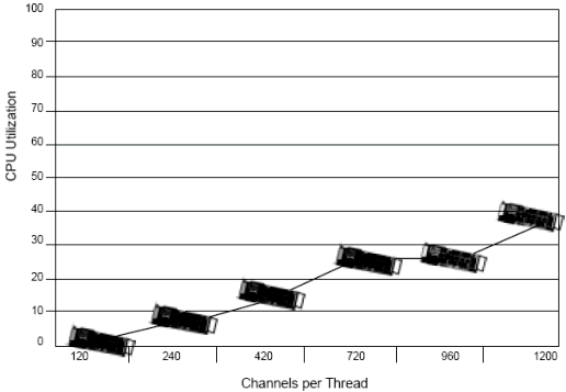 圖 3 顯示了運(yùn)行的線程數(shù)和不同的CPU使用率. 當(dāng)有多個(gè)一個(gè)線程運(yùn)行的時(shí)候, 每個(gè)線程處理一定的負(fù)荷. 例如, 如果有兩個(gè)線程運(yùn)行, 每個(gè)處理600個(gè)同時(shí)的放音.
