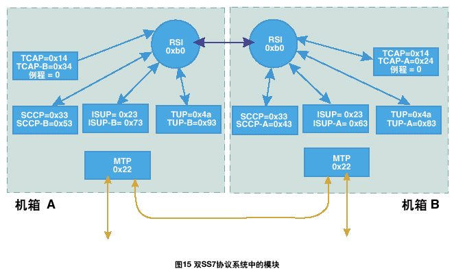下圖展示了一個(gè)雙ISUP/TUP/SCCP/TCAP系統(tǒng)中各模塊之間的關(guān)系,以及系統(tǒng)兩部分的config.txt文件中的相應(yīng)條目。參見圖15。