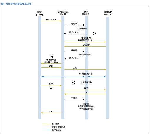 圖2是"代理RTP"在線錄音系統(tǒng)典型呼叫錄音的訊息流程圖解。圖中數(shù)字對(duì)應(yīng)于下文的段落編號(hào)。